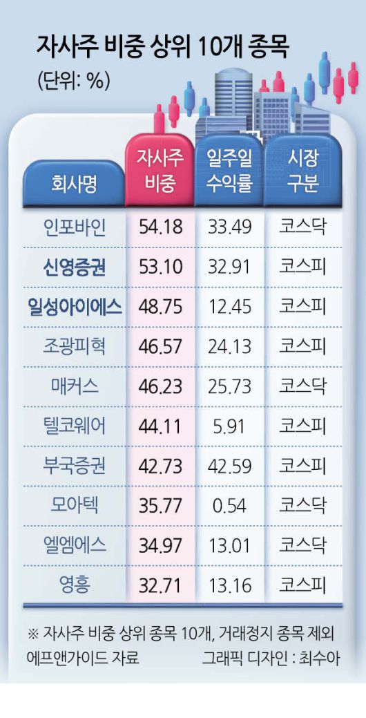 자사주를 가장 많이 보유한 기업은 인포바인으로 비중은 54.18%에 달한다. 뒤를 이어 신영증권(53.10%), 일성아이에스(48.75%), 조광피혁(46.57%), 매커스(46.23%) 순으로 상위 5개 기업이 모두 자사주 비중 45%를 웃돌았다.