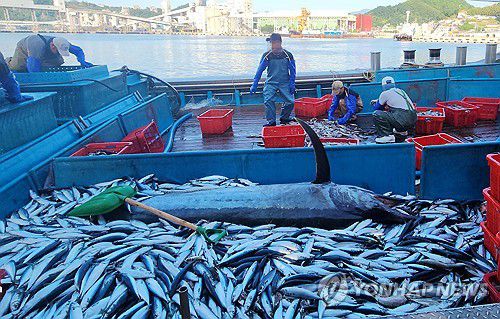 (삼척=연합뉴스) 10일 새벽 강원 삼척시 정라진 앞바다에서 정치망 어선인 S호에 아열대·열대 어종인 황새치가 잡혀 눈길을 끌고 있다.