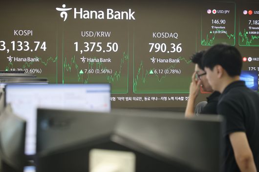 9일 장을 마감한 서울 중구 하나은행 본점 딜링룸에 코스피, 코스닥지수가 표시돼 있다. /연합뉴스 |
