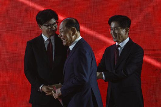 대선을 한 달 앞두고 있던 5월 3일 경기 고양시 킨텍스에서 열린 국민의힘 전당대회 도중 황우여(가운데) 국민의힘 경선 선거관리위원장이 개표결과 용지를 들고 한동훈(왼쪽)·김문수 당시 대선 경선 후보 앞을 지나가고 있다. 하상윤 기자 |