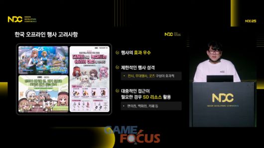이어 그는 오프라인 행사를 개최함에 있어 국가 별 특징과 고려해야 할 점에 대해 소개했다. 유 디렉터의 설명에 따르면 일본은 쌓여있는 노하우가 많아 이해도가 높은 에이전시를 찾는다면 매우 수월하게 오프라인 행사가 진행된다. 반대로 한국은 아직까지는 오프라인 행사나 굿즈 제작 노하우가 상대적으로 부족한 편이다. 때문에 개발사나 IP 홀더의 적극적인 개입이 필요하다는 설명이다.