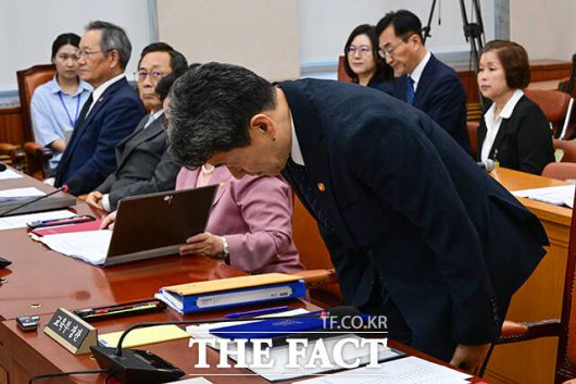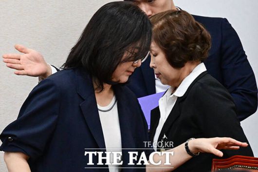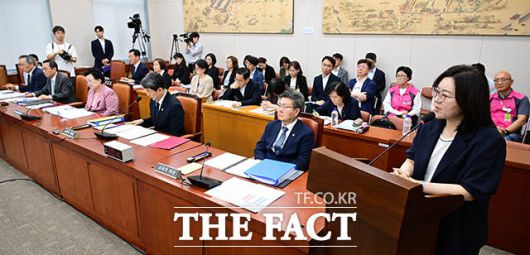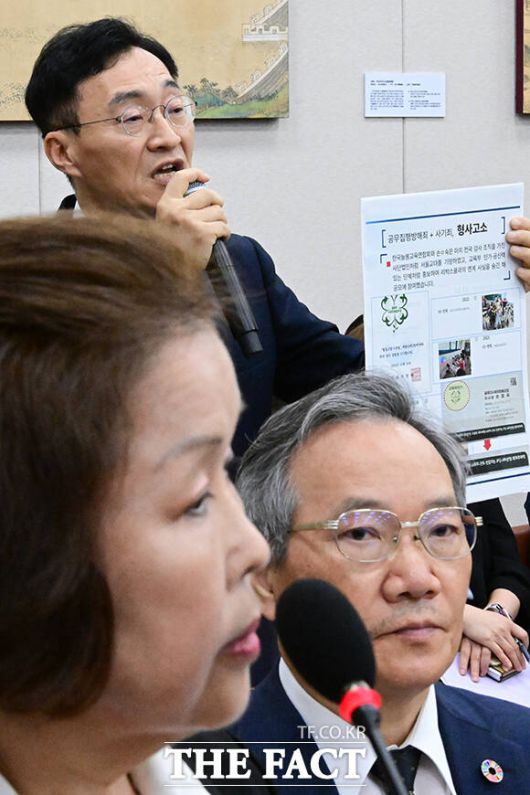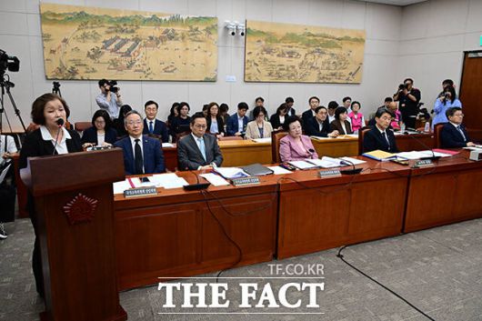 [더팩트ㅣ국회=남윤호 기자] 10일 오전 서울 여의도 국회 교육위원회에서 열린 '리박스쿨 청문회'에서 손효숙 리박스쿨 대표가 고민정 더불어민주당 의원의 질의를 들으며 눈을 질끈 감고 있다.