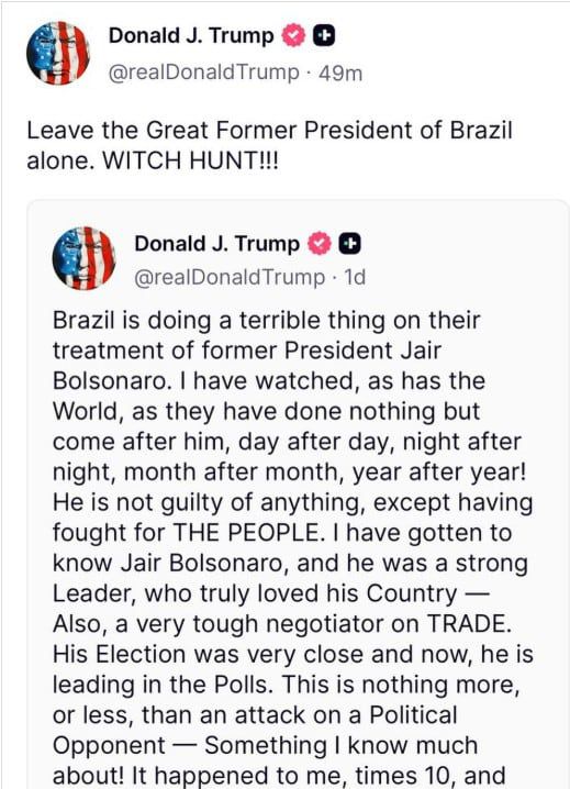 트럼프가 소셜미디어에 "브라질 정부가 전(前) 대통령 보우소나루에 대해 끔찍한 일을 저지르고 있다"며 "마녀 사냥을 멈추라"고 쓴 글./트루스소셜 |