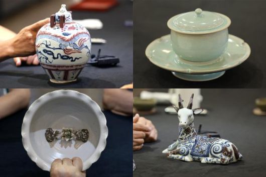 (Clockwise from top left) Lidded jar with blue-and-white underglaze red cloud and dragon chasing pearl design from the late Yuan to early Ming period, Ru ware covered bowl with lotus-shaped saucer from the Northern Song period, blue-and-white incense burner in the shape of a deer with iron-painted details from the Ming Xuande period, and Ding ware bowl with lotus petal decoration and wavy rim from the Northern Song period. Economic Daily Park Myung-seob |