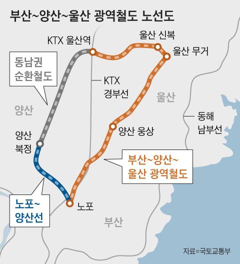 또 다른 광역철도사업인 ‘동남권 순환 광역철도’(KTX울산역~양산~김해)도 지난해 말 예타에 착수했다. 이 철도가 연결되면 울산~양산~부산~경남 김해~양산~울산으로 이어지는 순환 광역철도가 완성된다.