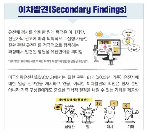 ▲ 질병관리청 국립보건연구원은 '한국인 이차발견 질환별 임상 가이드라인'을 발간했다고 10일 밝혔다. 이차발견은 검사를 의뢰한 원래 목적은 아니지만 적극적인 탐색 과정에서 질환 관련 변이를 발견하는 것을 의미한다. 예를 들면 근육병 환자 전장 유전체 분석을 통해 암 관련 유전자변이를 발견하는 것이다. 미국과 달리 국내 임상 현장에서는 결과 해석과 활용에 대한 가이드라인이 없었다. 보건연구원은 "국내 임상진료 목적의 유전차 검사에서 확인되는 한국인 이차발견과 관련해 검사 전 상담, 사전 동의, 이차발견 분석, 결과 전달 및 후속 관리까지 단계별 가이드라인을 마련했다"고 밝혔다. (서울=연합뉴스)