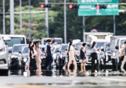 최고기온 오후 36도를 기록한 9일 오후 서울 영등포구 여의대로. 아스팔트에서 아지랑이가 피어오르는 가운데 시민들이 발걸음을 옮기고 있다. /고운호 기자 |