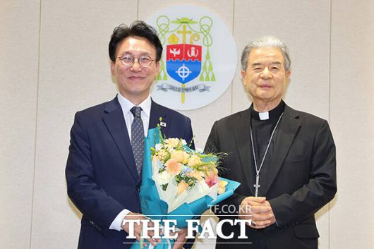 [더팩트ㅣ임영무 기자] 김민석 국무총리(왼쪽)가 10일 오후 경기 수원시 천주교수원교구청에서 한국천주교주교회의 의장인 이용훈 주교와 기념촬영을 하고 있다.