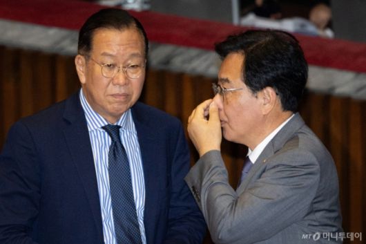 송언석 국민의힘 비상대책위원장 겸 원내대표가 10일 서울 여의도 국회에서 열린 제427회 국회(임시회) 제1차 본회의에서 권영세 의원과 대화하고 있다. 2025.7.10/사진=뉴스1 /사진=(서울=뉴스1) 유승관 기자 |