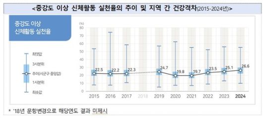 질병관리청은 10일 지역사회건강조사를 상세 분석한 결과 우리나라 성인이 중강도 이상의 신체활동을 실천하는 비율이 지난해 기준 26.6%에 그쳤다고 밝혔다. 2019년 24.7%에서 코로나19 팬데믹 여파로 2020년 19.8%, 2021년 19.7%로 급감한 후 2022년 23.5%, 2023년 25.1% 등으로 회복했지만 여전히 낮은 수준이다.