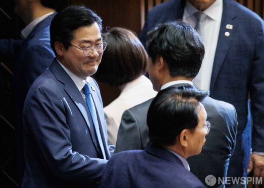 [서울=뉴스핌] 윤창빈 기자 = 박찬대 더불어민주당 의원이 10일 오후 서울 여의도 국회에서 열린 본회의에서 동료 의원들과 대화하고 있다. 2025.07.10 pangbin@newspim.com