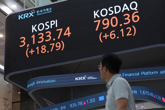A screen at the Korea Exchange in Yeouido, Seoul, displays the benchmark KOSPI index on July 9, 2025. The index closed up 18.79 points, or 0.60 percent, at 3,133.74—surpassing the previous closing high for the year of 3,116.27 set on July 3./Yonhap |