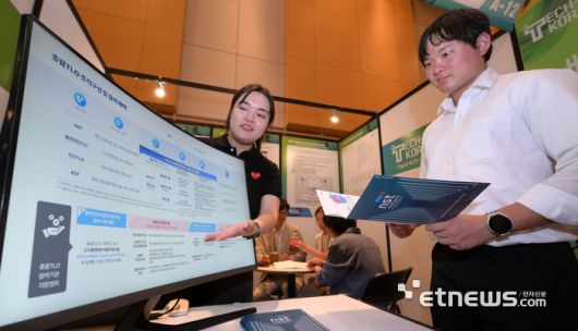 전자신문 주최 '테크비즈코리아 2025'가 '기술과 비즈니스의 만남'을 주제로 10일 대전컨벤션센터에서 열렸다. 정부출연연구기관을 비롯한 공공기관, 대학에서 개발된 기술이 민간부분으로 이전해 상용화할 수 있도록 연결해주는 기술교류의 장이 펼쳐졌다. 국가과학기술연구회 부스에서 참관객이 출연연 사업화공동추진 지원사업에 대한 설명을 듣고 있다.