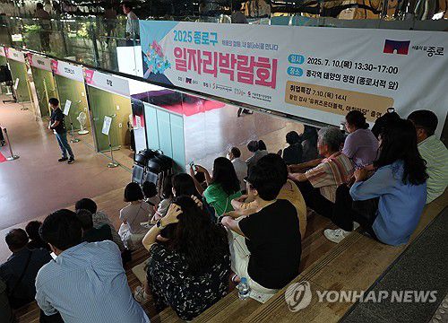 (서울=연합뉴스) 서명곤 기자 = 10일 서울 종각역 태양의 정원에서 열린 종로구 일자리 박람회를 찾은 구직자들이 취업 특강을 듣고 있다. 2025.7.10