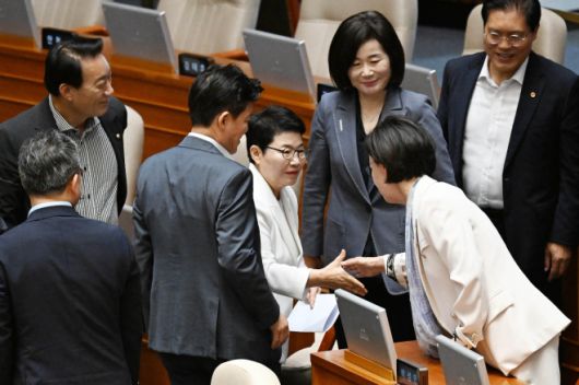 임이자 신임 국회 기획재정위원회 위원장이 10일 국회에서 열린 제427회국회(임시회) 제1차 본회의에서 동료의원들과 악수를 나누고 있다. 2025.7.10 홍윤기 기자 |