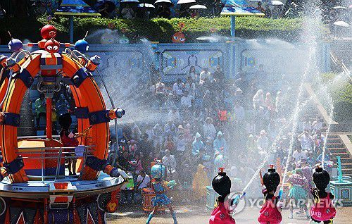 (용인=연합뉴스) 홍기원 기자 = 폭염이 이어지고 있는 10일 경기도 용인시 에버랜드를 찾은 시민들이 '슈팅 워터 펀 시즌2' 공연을 즐기고 있다. 2025.7.10
