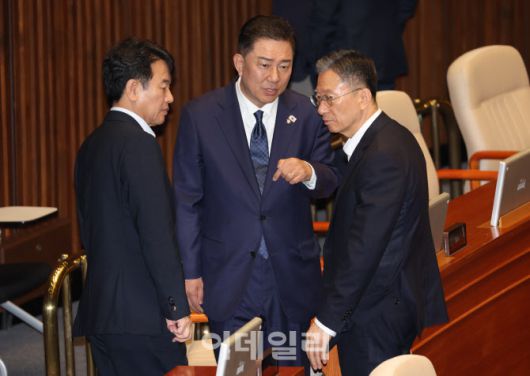 [이데일리 노진환 기자] 김병기(가운데) 더불어민주당 당대표 직무대행 겸 원내대표와 문진석(왼쪽) 원내수석부대표, 정성호 의원이 10일 오후 서울 여의도 국회에서 열린 제427회국회(임시회) 제1차 본회의에서 대화하고 있다.