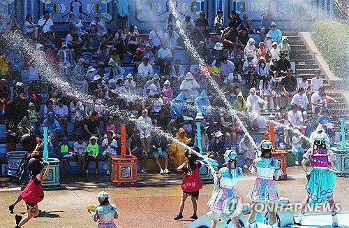 (용인=연합뉴스) 홍기원 기자 = 폭염이 이어지고 있는 10일 경기도 용인시 에버랜드를 찾은 시민들이 '슈팅 워터 펀 시즌2' 공연을 즐기고 있다. 2025.7.10