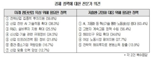 향후 5년간 중점적으로 추진할 정책으로는 '미래 첨단산업 육성'이 75.5%로 가장 높았고, '저출생·고령화 대응'(58.7%), '규제 개선'(32.3%), '인재양성'(31.4%), '재정·사회보험 지속가능성 확보'(26.5%), '지역경제 활성화'(26.5%) 등의 응답이 뒤를 이었다. 에너지시스템 전환·탄소중립 대응 24.5%, 노동시장 이중구조 해소 23.6%, 기타 1%다.