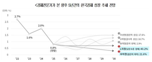 2026~2030년의 5년간 우리나라의 성장 추세에 대한 전망을 묻는 질문에 전문가의 40.2%가 성장률이 '낮은 수준에서 정체되는 L자형'을 보일 것으로 우려했으며, 21.6%는 '점진적인 우하향' 추세를 나타낼 것이라고 응답했다. 전문가 10명 중 6명(61.8%)이 우리 경제의 성장동력이 약해질 것이라고 본 것이다.