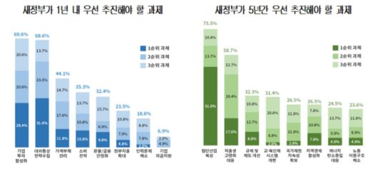새 정부가 우리경제의 성장 동력을 되살리기 위해 출범 후 1년 이내에 우선적으로 추진해야 할 경제정책이 무엇인지를 3순위까지 묻는 질문에는 '기업투자 활성화'(69.6%)와 '대외통상 전략 수립'(68.6%)이 가장 많이 꼽혔으며, 특히 통상전략은 1·2순위에서 가장 많은 선택을 받아 중요성이 큰 것으로 나타났다.