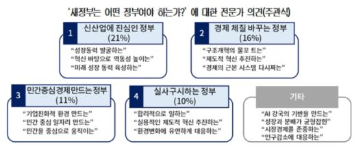 '새정부는 어떤 정부여야 하는가?'에 대한 주관식 질문을 의미 유사성에 의거해 집계한 결과, 전문가의 21%는 '미래 신산업 육성에 진심인 정부'가 필요하다는 취지의 응답을 했다. 경제의 새로운 성장동력을 발굴하고, 혁신을 바탕으로 역동성을 회복해야 한다는 것이다.