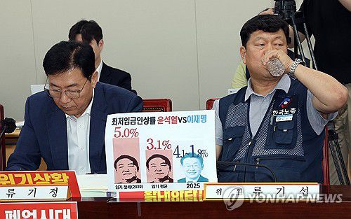 (세종=연합뉴스) 배재만 기자 = 최저임금위원회 근로자위원인 류기섭 한국노총 사무총장(오른쪽)이 10일 정부세종청사에서 열린 최저임금위원회 제12차 전원회의에서 물을 마시며 목을 축이고 있다. 왼쪽은 류기정 한국경영자총협회 전무. 2025.7.10