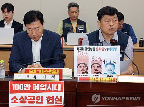 (세종=연합뉴스) 배재만 기자 = 최저임금위원회 근로자위원인 류기섭 한국노총 사무총장(오른쪽)이 10일 정부세종청사에서 열린 최저임금위원회 제12차 전원회의에서 발언하고 있다. 왼쪽은 사용자위원인 류기정 한국경영자총협회 전무. 2025.7.10