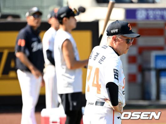 [OSEN=대전, 이대선 기자] 10일 오후 대전 한화생명볼파크에서 2025 신한 SOL Bank KBO리그 한화 이글스와 KIA 타이거즈의 경기가 열렸다. 한화는 황준서, KIA는 네일을 선발로 내세웠다. 경기에 앞서 한화 김경문 감독이 훈련을 바라보고 있다. 2025.07.10 /sunday@osen.co.kr