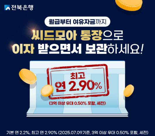 씨드모아 통장은 일별잔액에 대해 2.2%의 기본 금리를 제공하는 상품으로 전북은행 첫 거래 고객에게 이벤트 우대금리 연 0.7%포인트를 더해 최고 연 2.9% 금리를 제공한다.