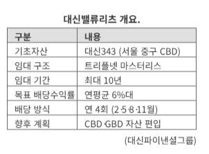 대신밸류리츠의 기초자산은 서울 중구 을지로 중심업무지구(CBD)에 위치한 ‘대신343’이다. 이 건물은 지하철 2·3·4호선과 40여 개의 버스 노선이 반경 500m 이내에 있어 대중교통 접근성이 높다. CBD에 위치한 만큼 주변 오피스 수요가 꾸준하고, 도심권이라는 점에서 안정적인 임대가 가능하다는 것이 특징이다.