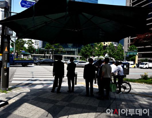 지난 8일 서울 을지로 횡단보도를 건너려는 시민들이 대형 파라솔 아래서 뜨거운 햇볕을 피하고 있다. 이날 서울 기온은 37도로 폭염 경보가 내려졌다./박성일 기자 |