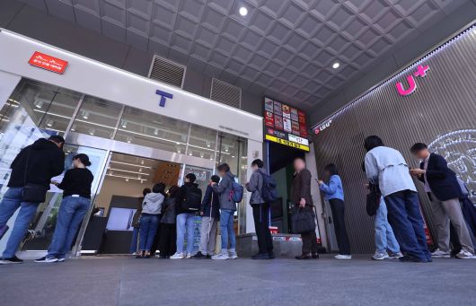 유심 무료교체를 위해 SK텔레콤 대리점에 시민들이 줄을 서서 교체를 기다리고 있다. [연합] |