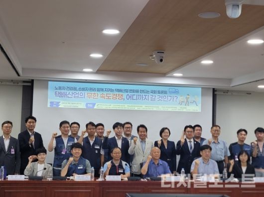 국회 '택배산업의 무한 속도 경쟁 어디까지 갈 것인가' 토론회 참석자들이 기념 촬영을 하고 있다. 사진=디지털포스트 |