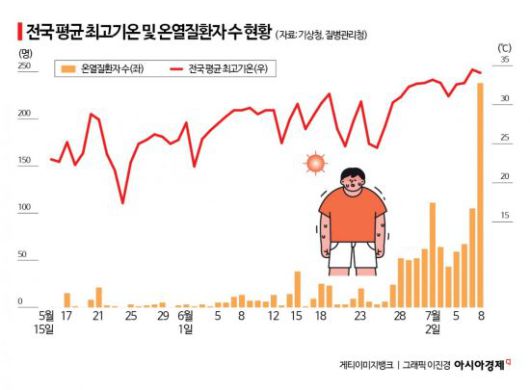 온열질환자는 지난달 28일 이후 전국 평균 최고기온이 31도 이상을 유지하면서 빠르게 늘어나는 양상이다. 이달 8일 하루에만 238명이 온열질환으로 응급실을 찾았는데, 일일 온열질환자가 200명을 넘은 것은 2018년 8월3일 이후 약 7년 만이다.