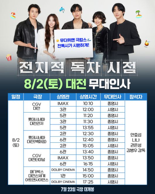 2일 대전 무대인사는 안효섭, 나나, 권은성, 김병우 감독이 CGV 대전, 롯데시네마 대전관저, 롯데시네마 대전(백화점), CGV 대전터미널, 메가박스 대전신세계 아트앤사이언스를 차례대로 방문해 '전지적 독자 시점'을 선택해 준 관객들에게 감사 인사를 전한다.