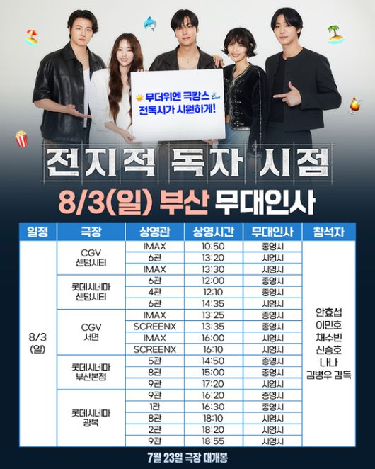 대전과 대구를 뜨겁게 달군 후 3일 부산에서 진행되는 무대인사는 안효섭, 이민호, 채수빈, 신승호, 나나, 김병우 감독이 모두 모여 CGV 센텀시티, 롯데시네마 센텀시티, CGV 서면, 롯데시네마 부산본점, 롯데시네마 광복까지 부산 곳곳을 돌며 뜨거운 팬서비스를 선사할 것으로 기대를 모은다.
