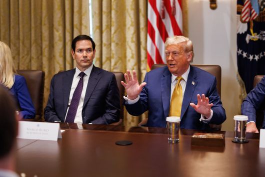 도널드 트럼프 미국 대통령과 마르코 루비오 미 국무장관이 8일(현지시각) 미국 워싱턴DC 백악관 내각실에서 열린 내각 회의에 참석해 있다. /연합뉴스 |