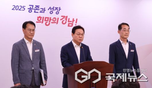 (경남=국제뉴스) 박완수(가운데) 경남도지사가 10일 오후 경남도청 브리핑룸에서 부산에서 경남 양산을 거쳐 울산을 연결하는 ‘부산~양산~울산광역철도’ 예비타당성 조사 통과와 관련한 브리핑을 갖고 있다. 사진=황재윤 기자 |