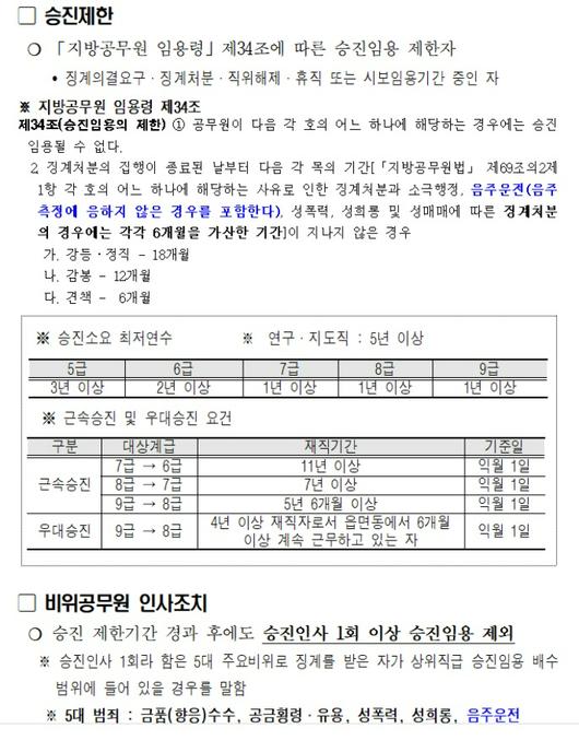 승진 제한 기간은 지방공무원법 임용령에 따라 성비위·음주운전 등으로 인해 징계 처분 집행이 종료된 날을 기준으로 하고 있다.