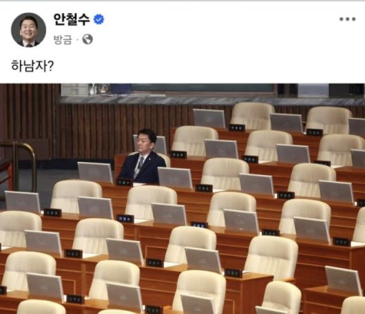 10일 안 의원은 자신의 페이스북에 “하남자?”라는 짧은 문구와 함께 지난해 12월 7일 윤석열 전 대통령의 1차 탄핵소추안 표결 당시 홀로 본회의장 자리를 지키며 투표에 응한 사진을 게시했다.