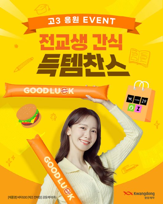 가장 많은 응원 메시지를 받은 학교 한 곳을 선정해, 고등학교 3학년 학생 전원에게 비타500과 햄버거로 구성된 간식 세트를 제공할 예정이다. 또한, 이벤트 참여자 중 추첨을 통해 총 15명에게 ▲W컨셉 ▲무신사 ▲29CM ▲올리브영 ▲지그재그 5개 플랫폼에서 20만원 한도 내의 경품을 선물로 증정한다.