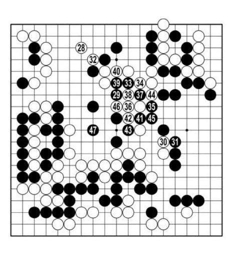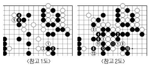 백28로 다가가며 끊자고 할 때 흑29로 뛰어 딴청을 부렸다. 백32가 아니라 <참고 1도> 1에 붙이고 3에 받아뒀으면 천둥 벼락 같은 변화는 일어나지 않았을 것이다. 흑은 37과 41로 끼우며 백 대마 이음새를 노렸다. 인공지능 카타고는 백44로 <참고 2도> 1로 따내라고 한다. 백13에 붙이면 잡히지 않는다.(7…)