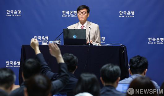 [서울=뉴스핌] 사진공동취재단 = 이창용 한국은행 총재가 10일 오전 서울 중구 한국은행에서 열린 통화정책방향 기자간담회에서 취재진 질문을 받고 있다. 2025.07.10 photo@newspim.com |