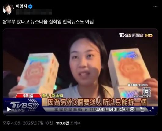 이영지는 대만 뉴스에 자신의 ‘짭부부’ 피해 사례가 소개됐다는 점에서 어리둥절했다. 이영지는 X(구 트위터)에 “짭부부 샀다고 뉴스 나옴. 실화임. 한국 뉴스도 아님”이라며 놀라워했다.