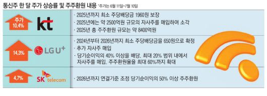 통신주는 외국인 보유 한도가 있어 외국인 지분율이 50%를 넘을 수 없다. 현재 KT는 외국인 소진율이 100%에 달하며 LG유플러스는 77%다. 그럼에도 개인과 기관은 2분기 영업이익 개선 기대와 주주환원 확대, 인공지능(AI) 관련 모멘텀 등에 관심을 보이며 이들에 대한 매수세를 높이고 있다.