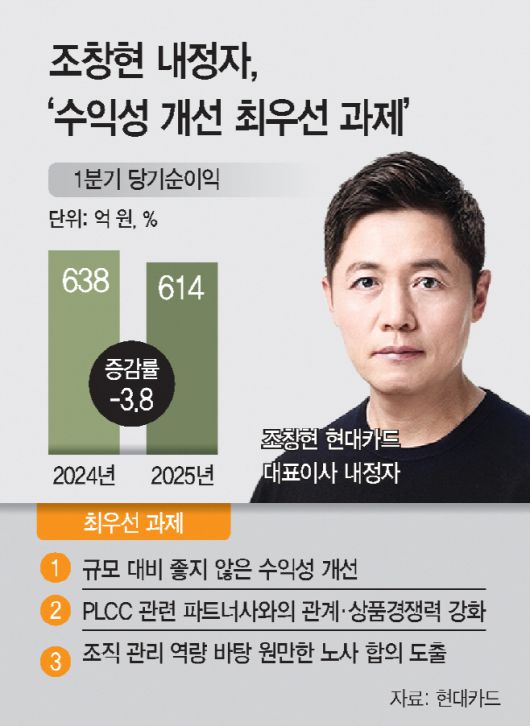 아시아투데이 김민혁 기자 = 현대카드 신임 대표이사로 내정된 조창현 전무의 어깨가 무겁다. 약화된 PLCC(상업자표시신용카드) 부문 입지 강화와 함께 부진한 수익성 개선해야 한다. 또 수개월간 이어지던 임금 및 단체협상이 결렬되는 등 경색된 노사관계도 회복시켜야 한다.