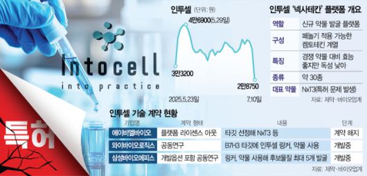 한편 한국거래소에 따르면 인투셀은 에이비엘바이오와의 계약 해지 소식이 알려진 이날 정규장에서 전날 대비 25.90% 하락한 2만 8750원에 거래를 마쳤다. 인투셀은 올 5월 23일 공모가 1만 7000원에 코스닥에 상장됐다.