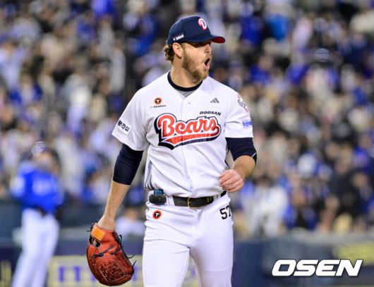[OSEN=잠실, 조은정 기자]28일 서울 송파구 잠실야구장에서 2025 신한 SOL Bank KBO리그 두산 베어스와 삼성 라이온즈의 경기가 열렸다.이날 홈팀 두산은 콜어빈을, 원정팀 삼성은 후라도를 선발 투수로 내세웠다.7회초 이닝을 마친 두산 콜어빈이 더그아웃으로 향하며 삼성 박병호를 향해 소리치고 있다. 2025.03.28 /cej@osen.co.kr |