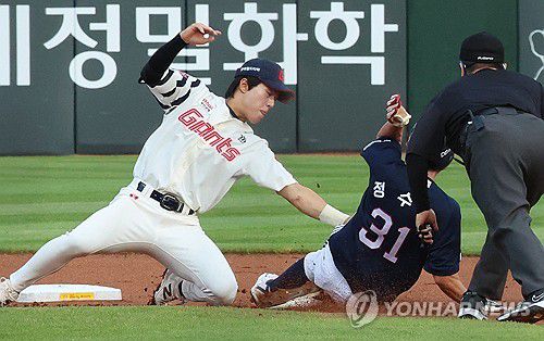 1회 초 무사 1루 두산 이유찬의 삼진 때 1루 주자 정수빈이 2루 도루에 실패하고 있다. 롯데 2루수는 한태양. 2025.7.10